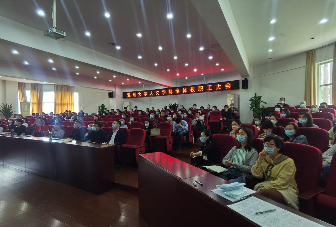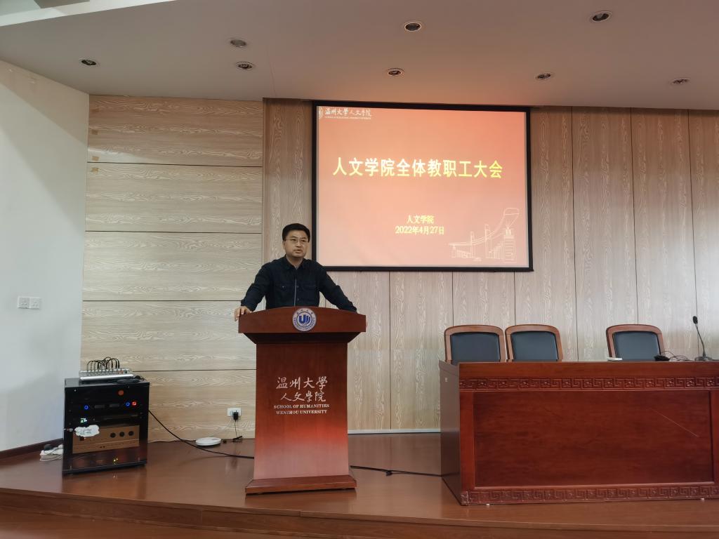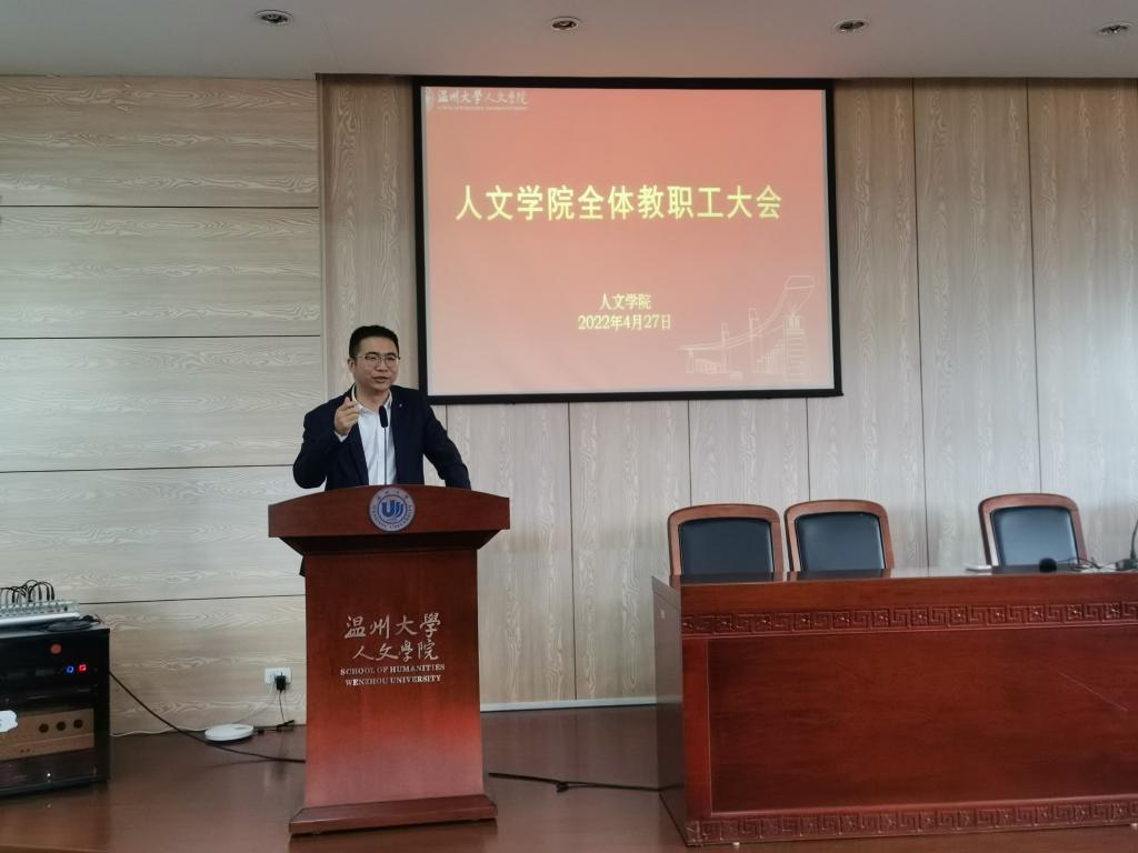 4月27日下午,吃瓜网 在人文楼203报告厅召开全体教职工大会,学院领导班子和全体教职工参加会议,会议由学院党委书记江秀景主持。
