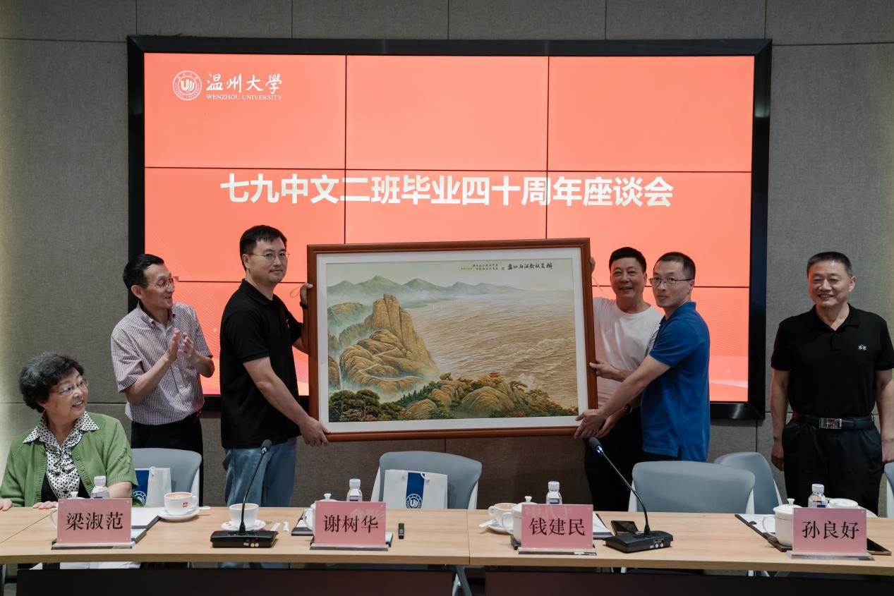 校友吴连生、黄培拉代表七九中文二班全班同学向母校赠送礼物——瓯塑瓯江山水,表达了对母校的深厚感情。