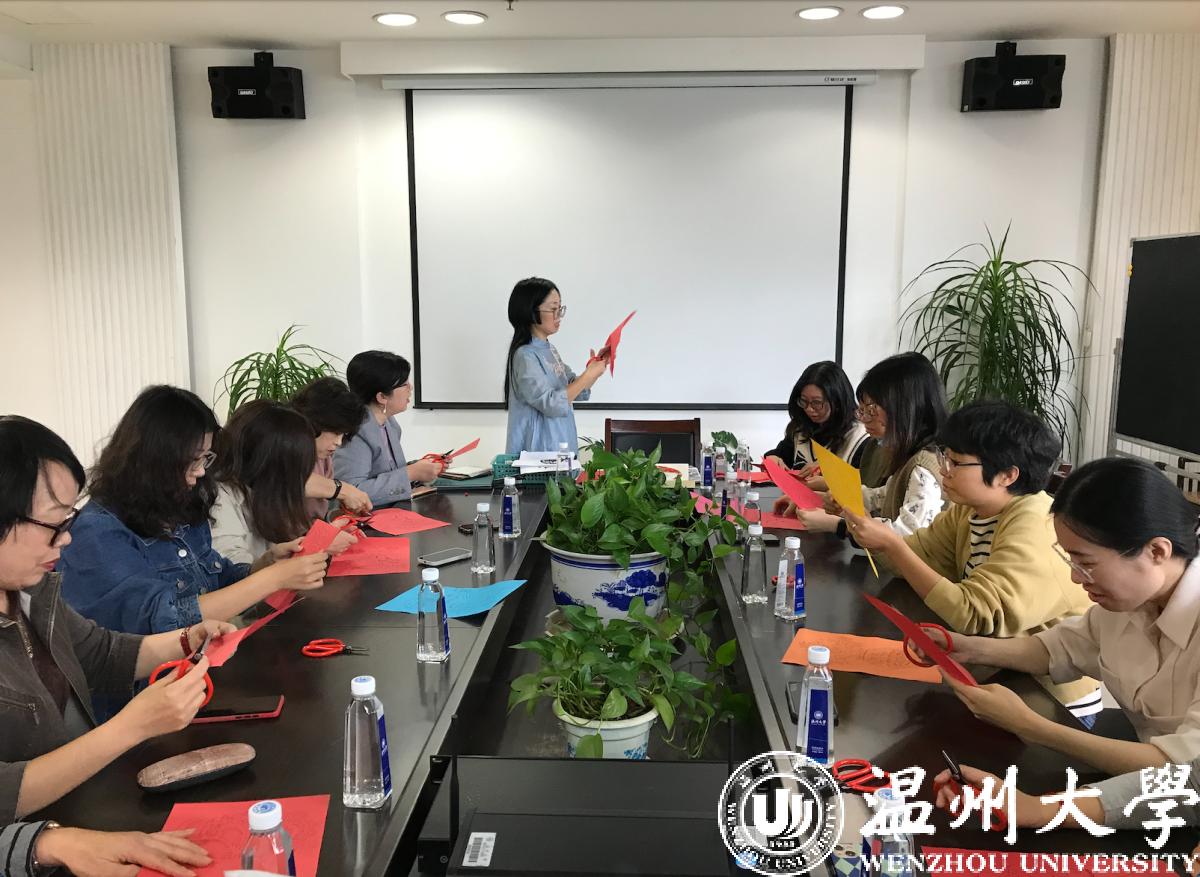 之后,就到了女教师们亲身体验温州特色“非物质文化遗产”艺术魅力的时候了。我们特别邀请到温州市瓯海区剪纸艺术传承人吴沈丹女士亲临现场,为老师们解说剪纸艺术的历史与独到魅力,并为大家细致讲授如何剪裁出一幅属于自己的剪纸艺术作品。