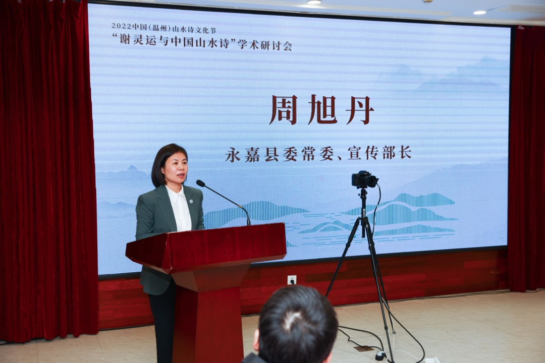 永嘉县委常委、宣传部长周旭丹女士出席并致辞。代表永嘉县委、县政府对与会的专家、学者表示衷心的感谢与热烈的欢迎,同时她希望以研讨会为契机,深入挖掘中国山水诗摇篮品牌的价值内涵,进一步深化对数字诗路驿站的开发推广和使用,加快文旅产业提质增效,让诗和远方在永嘉大地紧密牵手,为“千年商港、幸福温州”增光添彩。