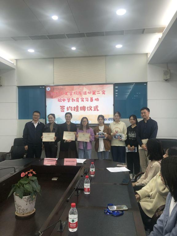 见面会伊始,冯主任首先介绍了出席见面会的双方人员,对吃瓜网 师生的到来表示热烈欢迎。潘智敏校长首先致辞,他从个人与温大中文系的渊源、与吃瓜网 教师的交往出发表达了对吃瓜网 前来教育见习的欢迎,随后向学院师生介绍了自身和学校的教育理念、学校的教学活动和教学环境,并表达了双方深化合作的期待。随后,孙良好院长代表学院向在疫情之下接纳教育见习的温州市第二实验中学的领导和老师表达了感谢,并从学院的理念、学科、专业简要的介绍了下学院的发展状况,以及表达了进一步深化两校合作的意愿。最后,孙院长对见习生们提出了要求,希望见习生们要有“学高为师”的意识,深入课堂,向指导师虚心请教,“身正为范”,要以老师的要求严格要求自己,引导学生成长。随后,双方领导签署了实习基地协议书,共同为“教育实习基地”揭牌并合影留念。接着,冯主任公布见习指导老师与见习学生的结对名单。孙院长为指导师发放聘书,潘校长则为所有见习生温馨送上定制的防疫物品和明信片,师徒结对并合影留念。见面的最后一项由见习生代表陈嘉慧发言,她表示自己很开心有机会前往温州市第二实验中学这样一所具有人文情怀和创新意识的实验型、示范性中学中进行教育见习,并向学校表达了感谢。她说将以成为一位好老师为奋斗目标,严格要求自己,不断提高自己,将一腔热诚投入到工作中去。