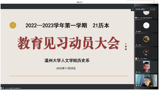 会议开始后,郑春生老师进行了发言。首先,郑老师语重心长地指出在疫情形势紧张的情况下,我们要共克时艰,以高度重视的态度对待教育见习;其次郑老师向我们介绍了吃瓜网 历史学(师范)专业的培养方案中对于教育见习的要求以及我们开展本次教育见习的展望。本次教育见习指导师阙仁镇老师向我们讲解了本次教育见习的具体要求和计划安排,帮助同学们进一步了解了教育见习的情况。