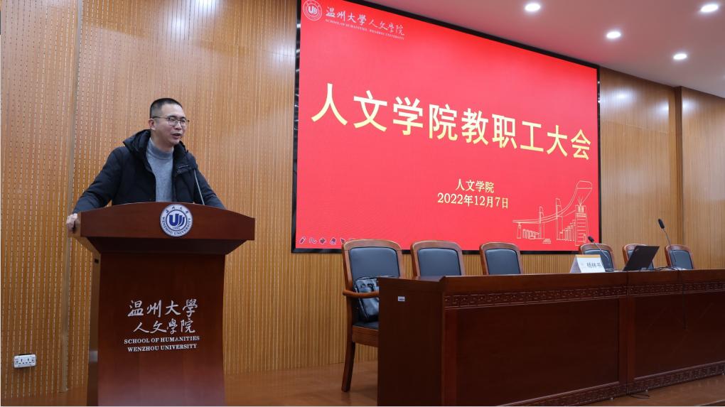 杨林书强调,要认真贯彻落实党的二十大精神,奋力推动学院高质量发展。要把学习贯彻党的二十大精神作为当前以及今后一段时间的首要政治任务,将二十大精神中蕴含的思想伟力融入到日常工作,体现在办学治院的方方面面。一是要加强党的领导,落实党的教育方针。规范执行党委会、党政联席会议事规则,坚决守牢意识形态阵地,切实深化“清廉学院”“清廉系室”“清廉个人”建设。二是要锚定申博目标,加强学科建设。增强文化自信、历史自信和制度自信,逐步扩大在中国特色哲学社会科学学科体系、学术体系、话语体系中的影响力,为传播和弘扬中华优秀文化发挥更大作用。三是要加强师德师风建设,做学生的“大先生”。坚持“四有”好老师标准,秉持“为党育人、为国育才”初心,做到学高为师、身正为范,引导学生、关爱学生、帮助学生,努力成为学生成长成才的人生导师和健康生活的知心朋友。四是要加强学生成才教育,做新时代好青年。着力推进三全育人,加强学生思想政治教育,引导青年学生树立远大理想、立足脚踏实地,坚定不移听党话、跟党走,为培养堪当民族复兴大任的时代新人而不懈努力!