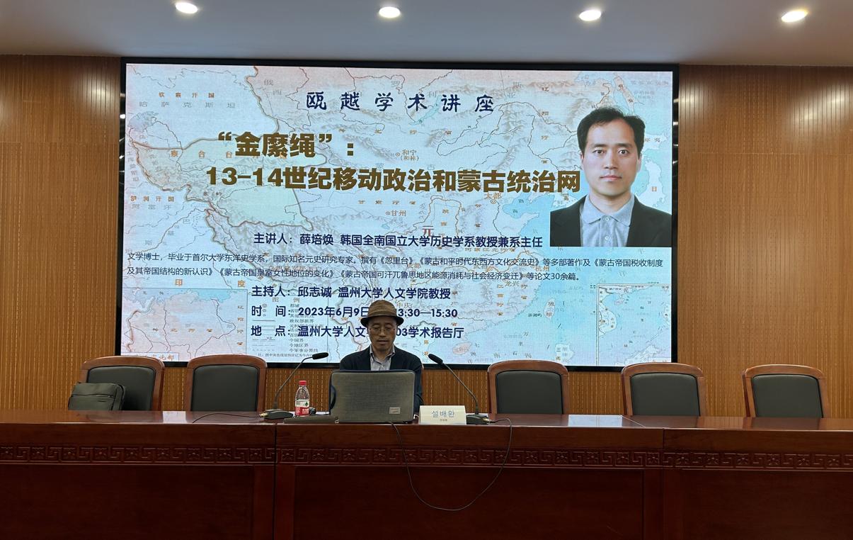 2023年6月9日下午,韩国全南国立大学历史系教授兼系主任설배환薛培煥)教授应邀在吃瓜网 学术报告厅举行了题为《“金縻绳”:1314世纪移动政治和蒙古统治网》的学术讲座。本次讲座由邱志诚教授主持,王长命副教授及相关专业本科生、研究生60多人参加了讲座。我校教育学院郑晓丽教授、潘盈盈博士也出席了讲座活动。