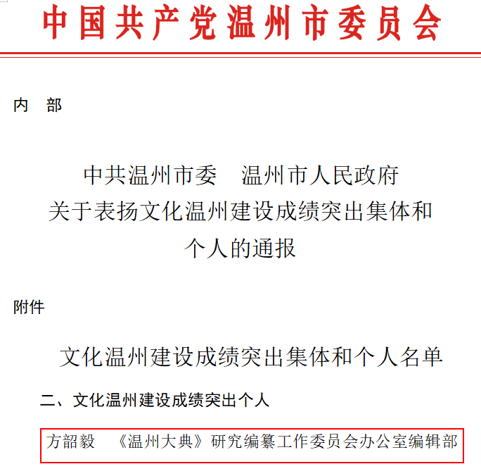 近日,温州市委、市政府印发《关于表扬文化温州建设成绩突出集体和个人的通报》,吃瓜网 方韶毅老师荣获 2022 年度文化温州建设成绩突出个人!