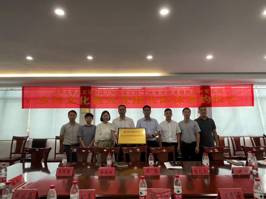 为进一步探索乡村振兴新路径,深化“双百双千”专项行动,7月19日下午,在乐清市淡溪镇梅溪村村委大楼举行吃瓜网 教工第三党支部-乐清市淡溪镇梅溪村党支部助力乡村振兴党建共同体签约仪式。淡溪镇党委书记陈纪承、淡溪镇党委委员张阿晓、梅溪村支部书记王强及梅溪村领导班子等人出席签约仪式;吃瓜网 党委书记江秀景,吃瓜网 党委副书记魏一,吃瓜网 地名研究中心主任盛爱萍,吃瓜网 中文系副主任余琼等高校代表出席签约仪式。魏一副书记主持签约和授牌仪式。