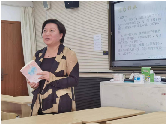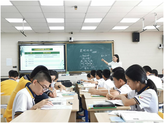 金彤彤老师精心备课,认真听取指导师意见,为大家带来一堂《昆明的雨》。她先以飞花令的形式导入课堂,让整个课堂充满诗意。在她的循循善诱下,学生们沉浸式感悟了汪曾祺笔下的景物之美、滋味之美、人情之美、氛围之美。这堂课不仅使学生欣赏到了美文的趣味、更感受了美育的温度,体现了以生为本的教学理念。