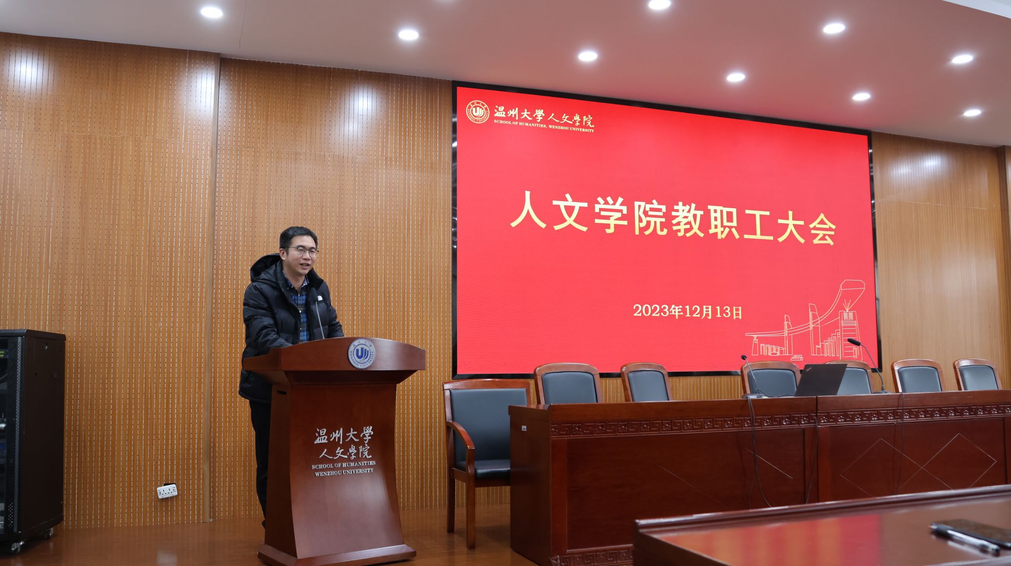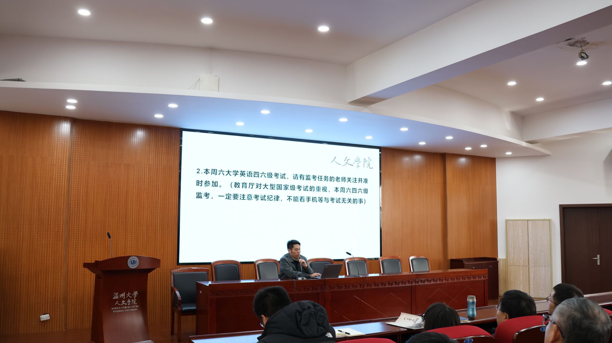 陈源源副院长向全院各位老师通报本学期学科、科研、研究生方面的相关工作以及近期的相关安排,并对中文学科申博工作进行了展望。