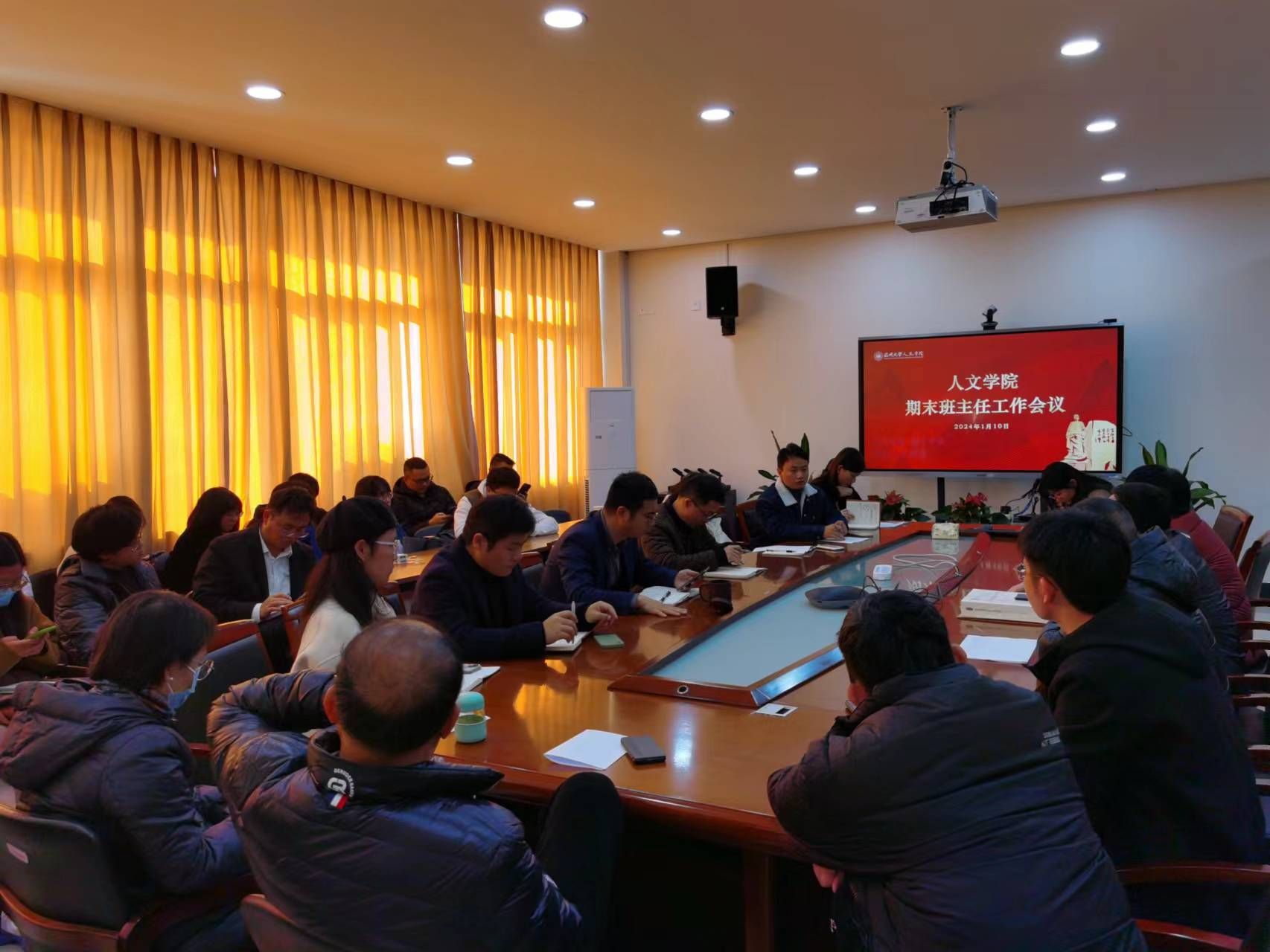 2024年1月10日下午,吃瓜网 在人文楼213会议室召开了期末班主任工作会议。参加本次会议的有院党委书记江秀景、院党委副书记魏一,学工办副主任申业磊、辅导员李丹萍、张丹妮、刘炳林、刘恭宇、王佳慧以及各班班主任。会议由院党委副书记魏一主持。