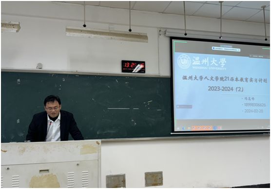 紧接着,实习项目负责人冯高峰老师以学长学姐竞赛中的优秀表现激励大家,将专业知识学习与实践相结合,在实践中检验所学,提升师范技能。同时,他还从教育实习目的、实习安排和注意事项等方面,对此次教育实习进行了全景式介绍。