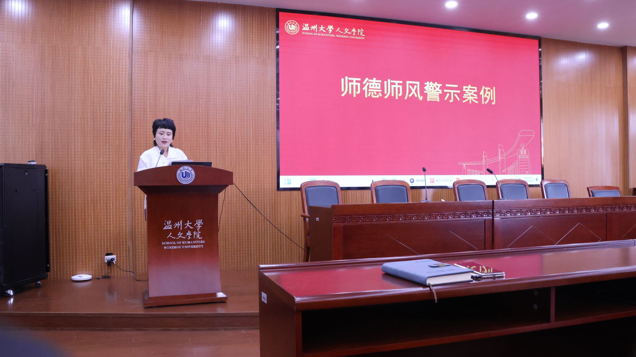 紧扣师德教育实施方案“五个一”活动之“组织一次警示教育”,黄玮副书记随后作了师德师风警示教育,通报了全国一系列违反师德师风的典型案例,警示每位教师要以案为镜,规范自身言行,自觉加强师德修养。同时,她还就近期学生工作、毕业生就业情况作了详细汇报,分析了当前学生工作的重点和难点,并提出了针对性的解决方案。