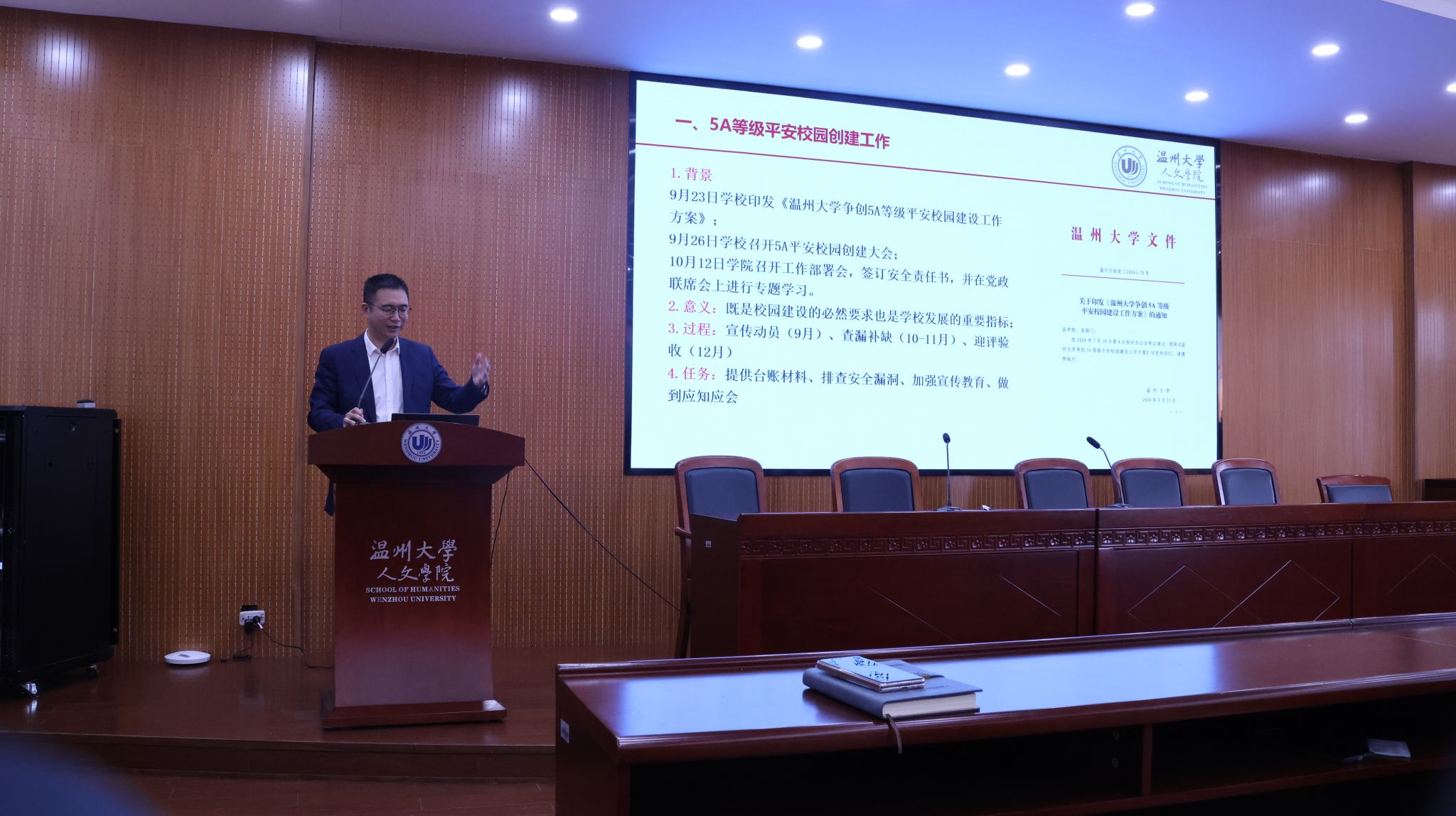 随后,江书记就5A平安校园建设进行了详细讲解,强调了校园安全的重要性,特别提醒全体教职工要时刻保持警惕,关注学生的日常安全,确保学生在校园内的学习和生活能够顺利进行,并号召全体教职工共同参与到平安校园的建设中来。接着,他就校内岗位聘任、学院运动休闲区建设、科研用房等具体工作进行了部署。