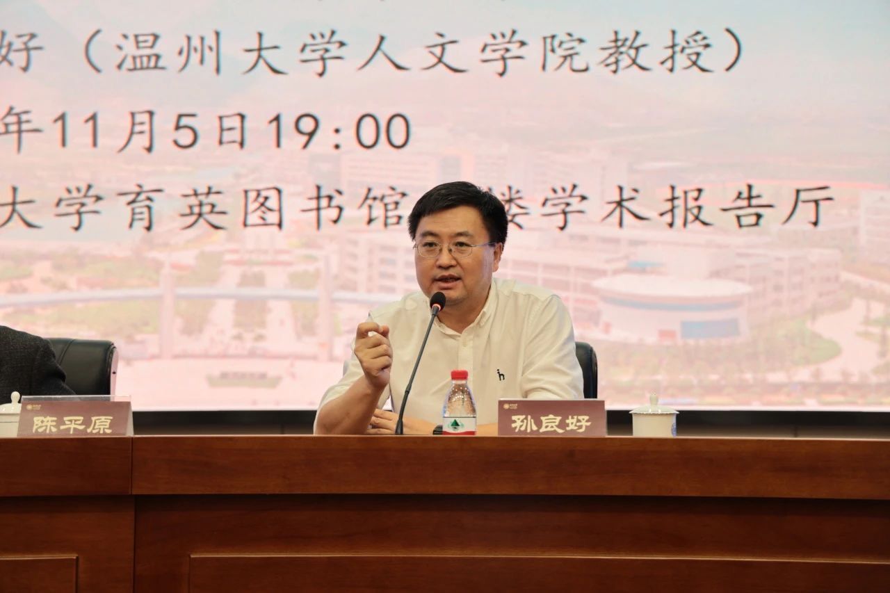 主持人孙良好教授用“十年之约”“联袂而来”“三位一体”三个词介绍了陈平原教授与罗山讲堂的因缘。第一,“十年之约”是指陈平原教授接受了孙良好教授十年之约的邀请,自2014年春天做客罗山讲堂后,再一次来到了吃瓜网 ;第二,“联袂而来”是指陈平原教授与夏晓虹教授这对中国文学研究界的“神雕侠侣”,自2014年4月15日晚上在温大图书馆分别以“烽火连八年,弦歌抵万金——中国大学西迁的历史及精神”和“二十世纪秋瑾文学形象的变迁”为题讲演后,再次联袂来到吃瓜网 。第三,孙良好教授认为陈平原教授是集文学、大学、读书为一体的学者,他说:“陈平原教授是国内少有的文科一级教授,不仅是文学研究的大家,也是大学研究的大家,还有很多与读书相关的著述。在我看来,文学、大学、读书在陈老师身上是三位一体的,是水乳交融的。”