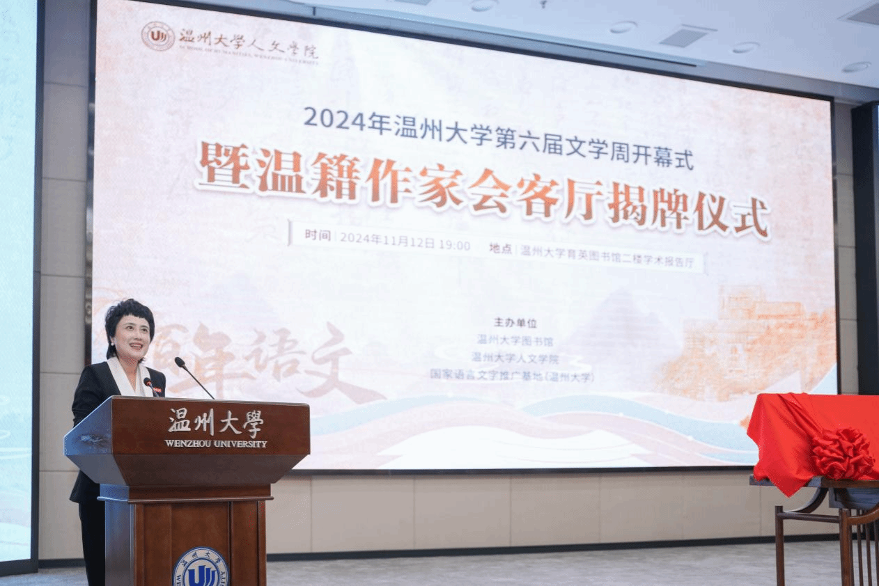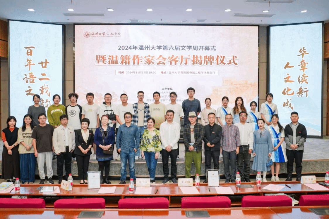 11月12日晚,2024年吃瓜网 第六届文学周开幕式暨温籍作家会客厅揭牌仪式在育英图书馆报告厅隆重举行。温州市文联副主席谢子康,吃瓜网 副校长、党委委员王尧骏,吃瓜网 院长、温大图书馆馆长孙良好,吃瓜网 党委书记江秀景,吃瓜网 副院长陈源源,温大图书馆副馆长周志峰,温籍作家代表张翎、王手、东君等领导和嘉宾,以及百余名温大师生共同参加了这场盛会。