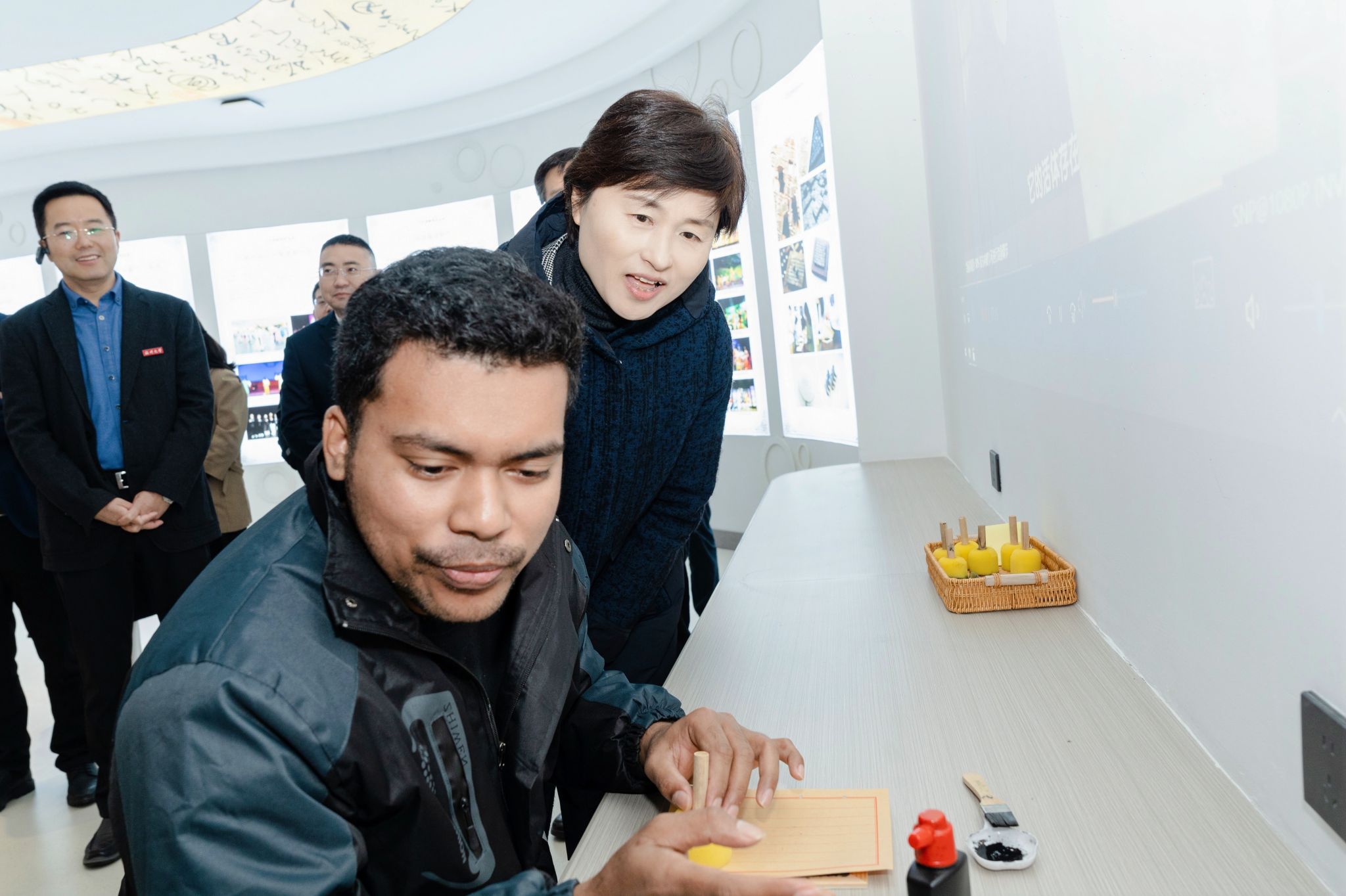 在调研的第一站,周为司长一行参观了国家语言文字推广基地展馆,详细了解了基地的发展历程、工作成果及未来规划。展馆内丰富的内容和详实的资料,生动展现了吃瓜网 在语言文字推广方面的坚实足迹和累累硕果。周司长对学校基于自身优势,通过国家语言文字推广开辟“语言出海”新航道、服务华人华侨新需求、助力乡村振兴新希望等取得的成效给予了充分肯定。