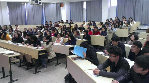 2014届毕业生齐聚人文楼101教室,参加由学院学生科组织的毕业生就业动员大会。会议由辅导员刘纪峰老师主持,学生科科长曾蓓蕾老师出席并讲话。