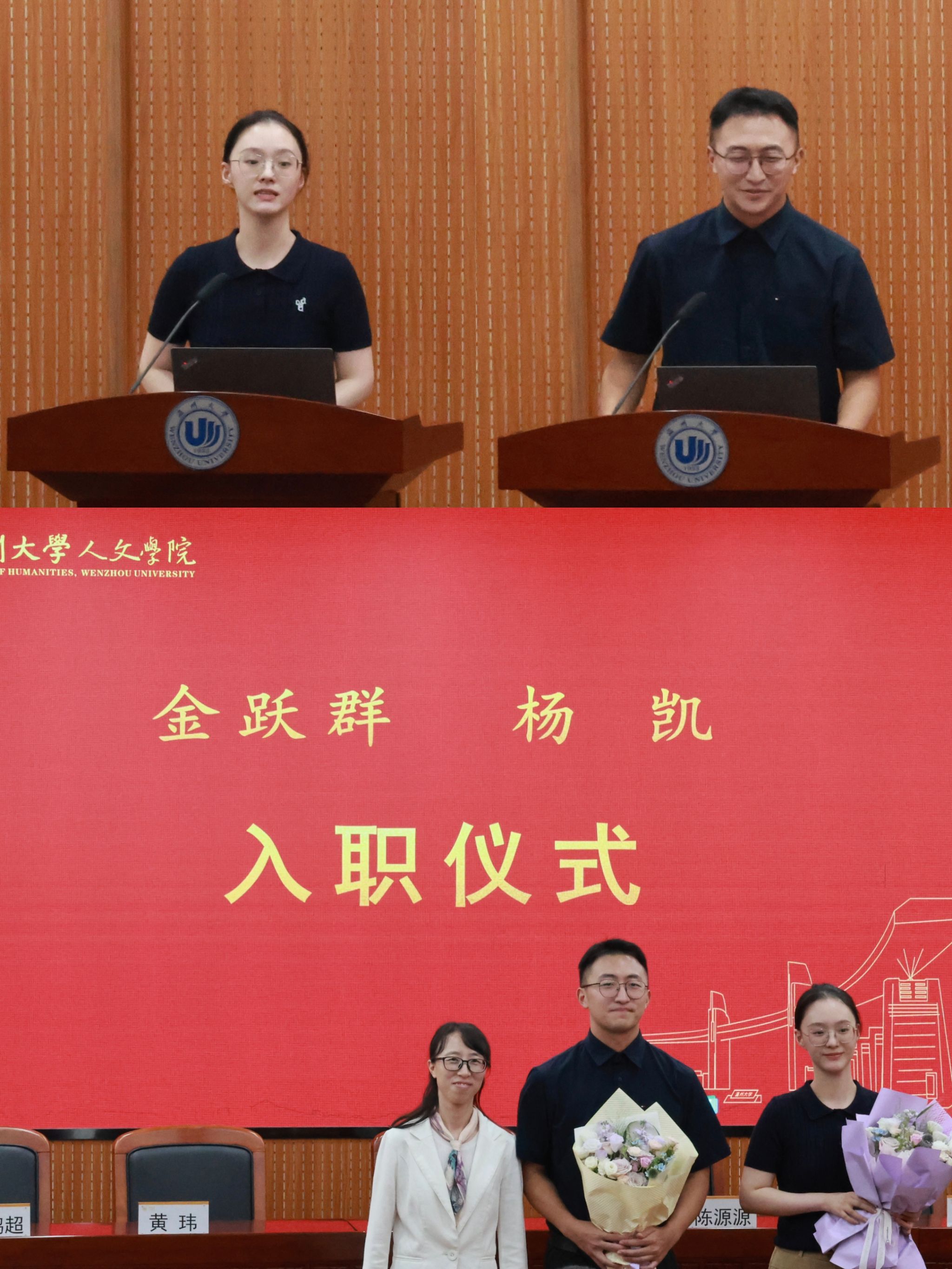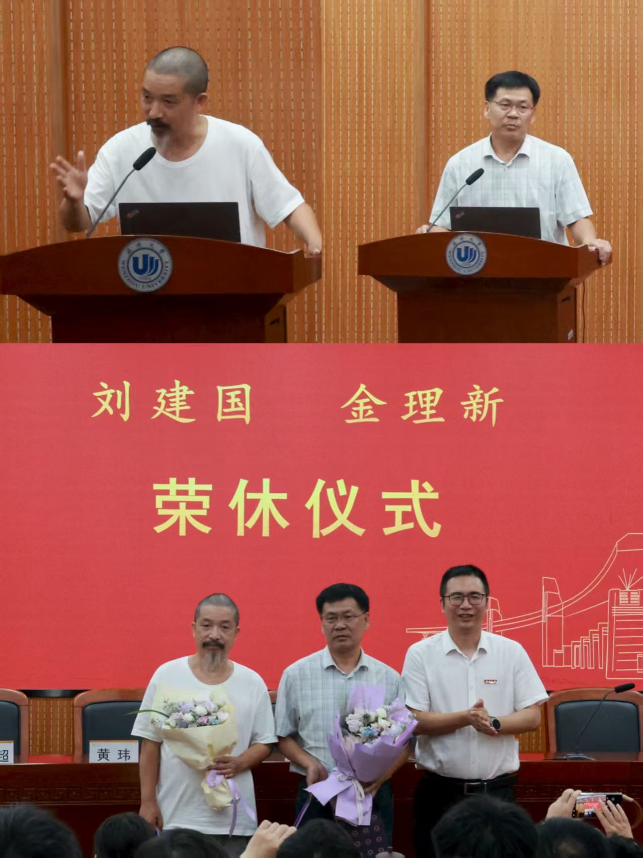 会议首先举行了教师荣退和新教师欢迎仪式。刘建国和金理新两位荣休教师依次上台发言,深情回顾在学院工作三十余年的难忘岁月,表达对学院和同事们的深厚情谊,以及对学院未来发展的美好期许,江秀景书记为他们送上鲜花和纪念品。陈源源副院长为杨凯和金跃群两位新教师送上鲜花,并对他们的加入表示热烈欢迎,鼓励他们在学院开启精彩的职业生涯,为学院发展贡献力量。