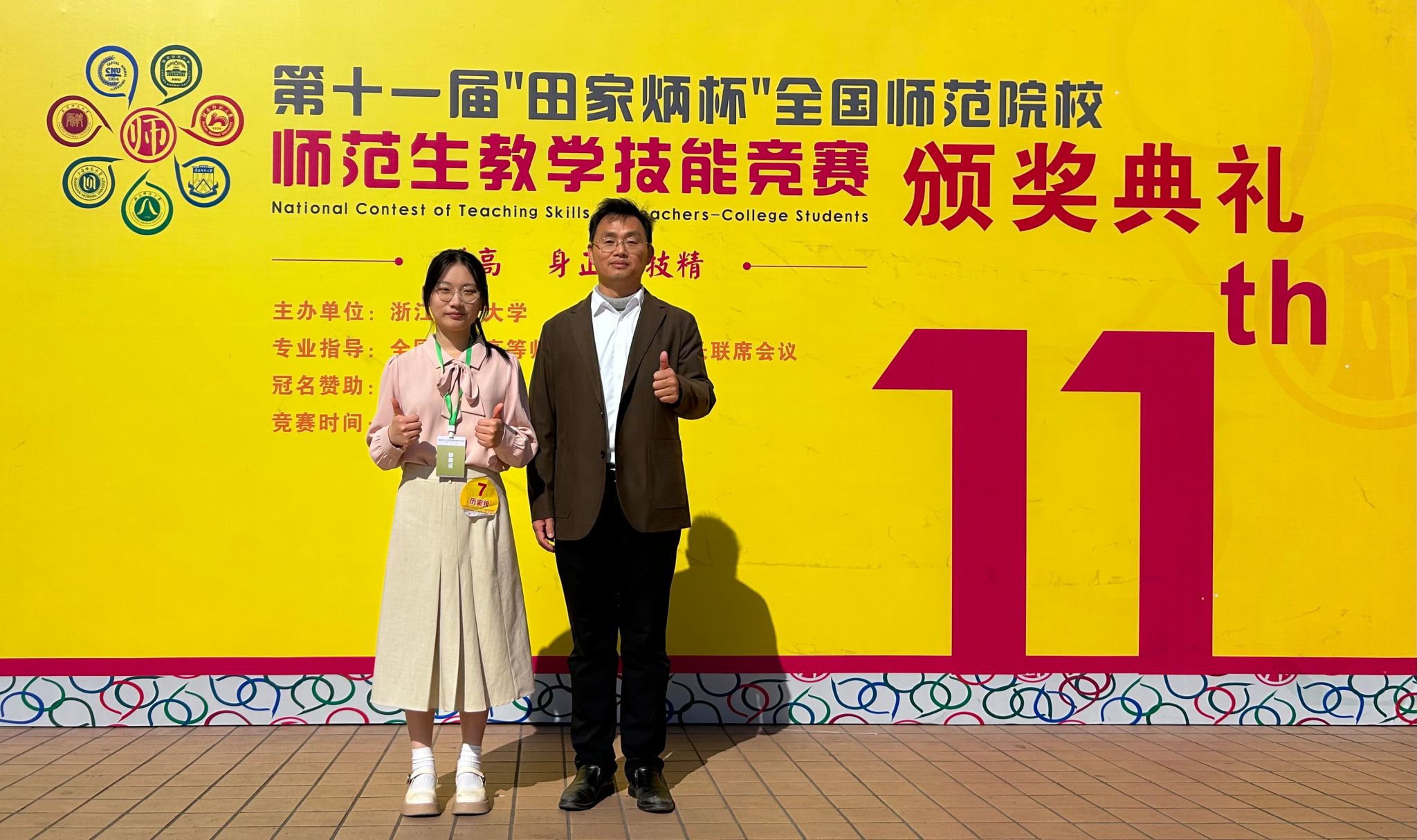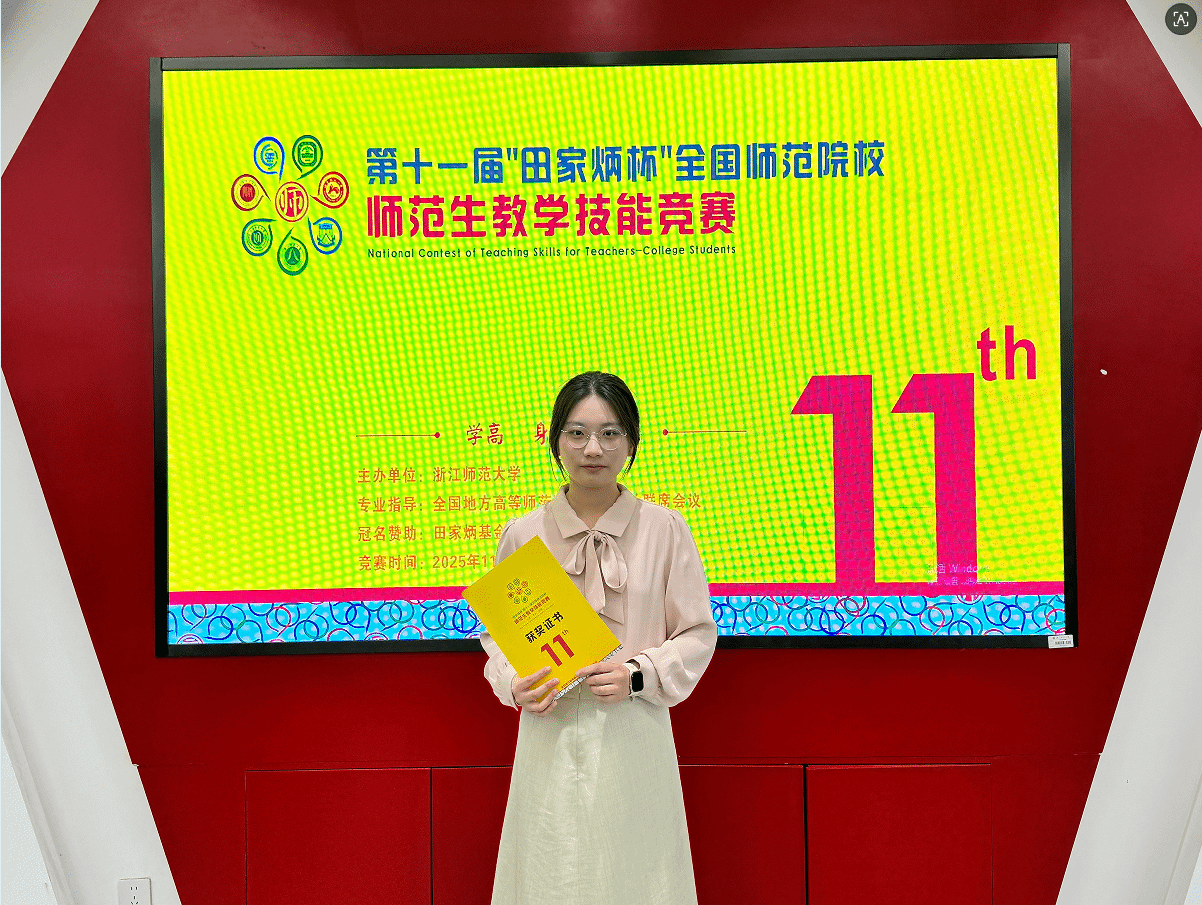 2025年11月28日至30日,在浙江师范大学举行的第十一届“田家炳杯”全国师范院校师范生教学技能竞赛决赛中,吃瓜网 22级历史学(师范)专业的朱心语同学荣获高中历史组一等奖。