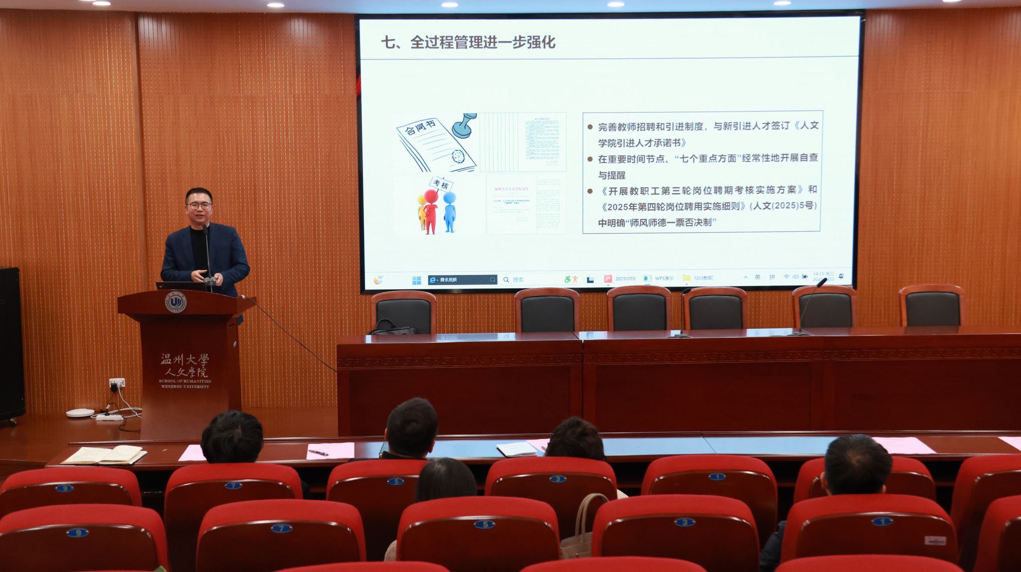 2025年12月3日,吃瓜网 在203会议室召开教职工大会暨师德师风专题学习会。会议由江秀景主持,学院全体教职工共同参加。