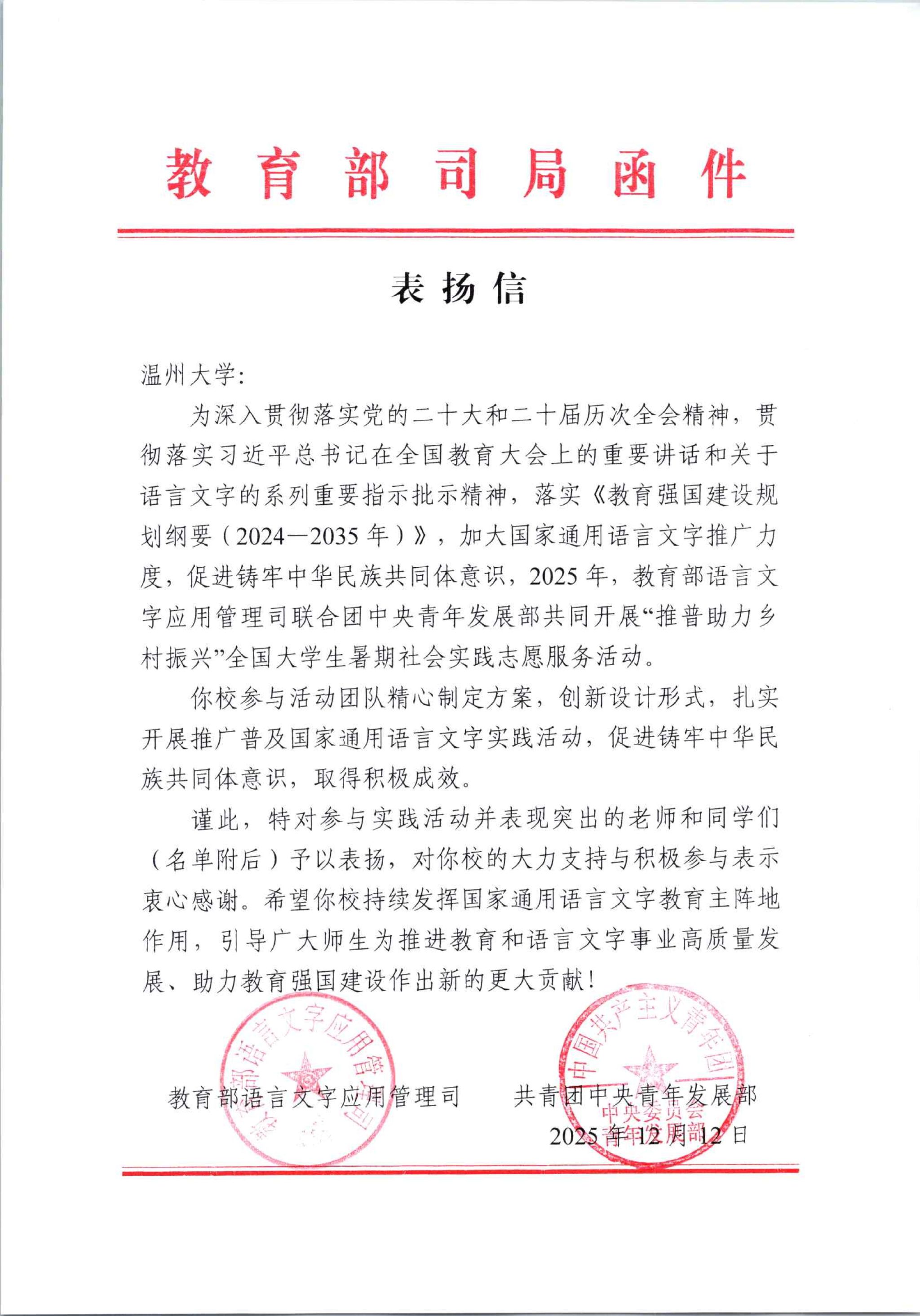 近日,教育部语言文字应用管理司与共青团中央青年发展部的联合发出表扬信,表彰2025年“推普助力乡村振兴”全国大学生暑期社会实践志愿服务活动中表现突出的实践队。我校“知语识文”国家通用语言文字推广暑期实践队从全国2000支队伍中脱颖而出,连续第二年成为400支受表扬队伍之一。