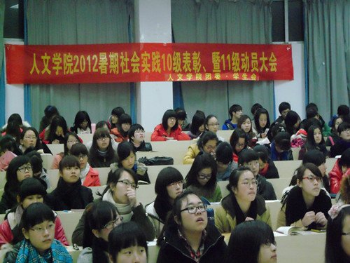 2012年暑期社会实践10级表彰暨11级动员大会拉开了序幕。本次出席会议的有辅导员麻法全老师,学生会主席罗倩倩和学生会副主席蒋文晨。