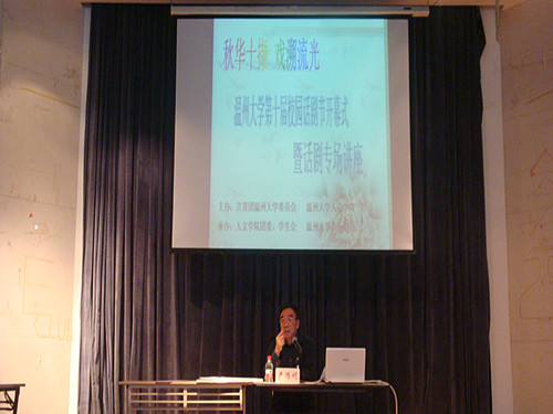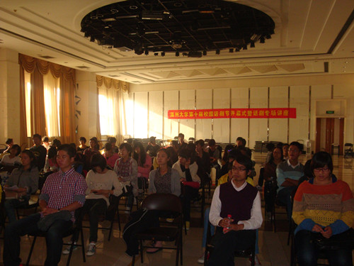 在主持人戚丽珊同学的介绍下,严路明老师走上讲台。一开场,他就亲切地问候在场的老师和学生们,话语中流露出严老师对大学生未来话剧发展的支持和殷切期望。之后,严老师就话剧的三个特点和温州话剧发展的三个高潮展开叙述,并指出第三次话剧发展的高潮正事现在,正是当代大学生们所融入的时代,他还希望当代大学生能成为话剧发展的不竭动力。然后,严老师切入正题,结合现实话剧表演中的例子生动形象地分析话剧是什么,如何演好话剧。其中,他就如何挑剧本,做导演,当演员这些问题作了详细的讲解。台下的同学连连点头表示认同,并及时做下笔记,以备日后排练之用。最后,严老师和同学进行了面对面提问交流和现场假动作教学,这些都是学生们受益匪浅。开幕式在一片欢声中结束。