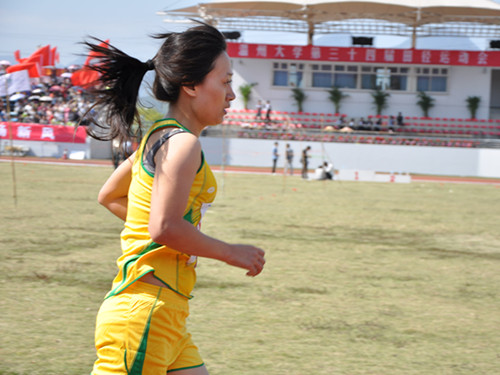 选手们互不示弱,咬牙拼着耐力;观众们的呐喊声此起彼伏,一浪高过一浪。主席台也不时传来振奋人心的音乐,既是给选手们的鼓励,也是由衷的赞许和肯定。当最后一圈的铃声叮当响起,激动的时刻来临了。各位选手都进入了最后的冲刺阶段。啦啦队们也达到了白热化状态。所有人都扯着嗓子为自己的学院呼喊助威。急促的鼓点咚咚落下,好似运动员的脚步一样拨动人们的心弦。当刘菲菲亮丽的身影到达终点,台上的掌声如潮水般涌来,经久不息。在这其中,有感动,有钦佩,有肯定,有祝福......太多的太多包含其中。