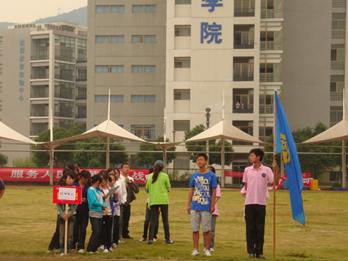当然,我们在关注运动员精彩拼搏的同时也不要忽略了身边这样一群可敬可爱的人儿们。他们虽不是万众瞩目,却常常出现在我们的视野中;他们虽没有收获热烈的欢呼和掌声,却依然兢兢业业也默默付出着;他们热情高涨,他们青春活力,他们就是我们的志愿者们。在运动会的赛场上,你一定常常看到这一群身着草绿色服装的年轻人,他们奔跑在操场的每一个角落。检录、领队、送水、扶人,这些繁琐而细小的事情他们做的井井有条并且乐此不疲。记得在1500米的比赛时,天下起了小雨,看台上的同学陆续撑起了伞,但是我们发现那一个个绿色的小精灵却依然认真的守在自己的岗位上。虽然没有伞,但雨中的他们显得更加可爱动人。运动会结束以后,我报采访到了一个大一的新生,她作为志愿者参与了这次的运动会,她说:"相比运动员的耀眼,我们默默无闻,但我喜欢这样的付出的感觉。因为我们是他们坚强的后盾。"一群可爱的人,在一起做一件美好的事!