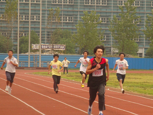 最引人瞩目的是一名穿绿色运动服的159号,他步履轻快,双腿有节奏的迈动,在阳光下可以看到小腿紧绷的肌肉。他表情沉静,波澜不惊,张开嘴均匀地吐气吸气。在跑了许久之后,显得格外沉静,只是专心的跑着,专心的在做一件很需要耐心的事。他始终占据着第三名的位置,与第二名保持不大不小的一段距离。前面若是快了,他紧追几步,慢了,他就慢慢的拉近一段距离,像一张弓一般张弛有度。第一名的位置是另一番光景,047号高高地仰着头,咬紧牙关,涨红着脸,奋力的跑着,汗水顺着脸颊流下。然而似乎显得有点力不从心,速度渐缓,而后面的人却如甩不掉的橡皮糖一般紧紧跟随,咬住不放。