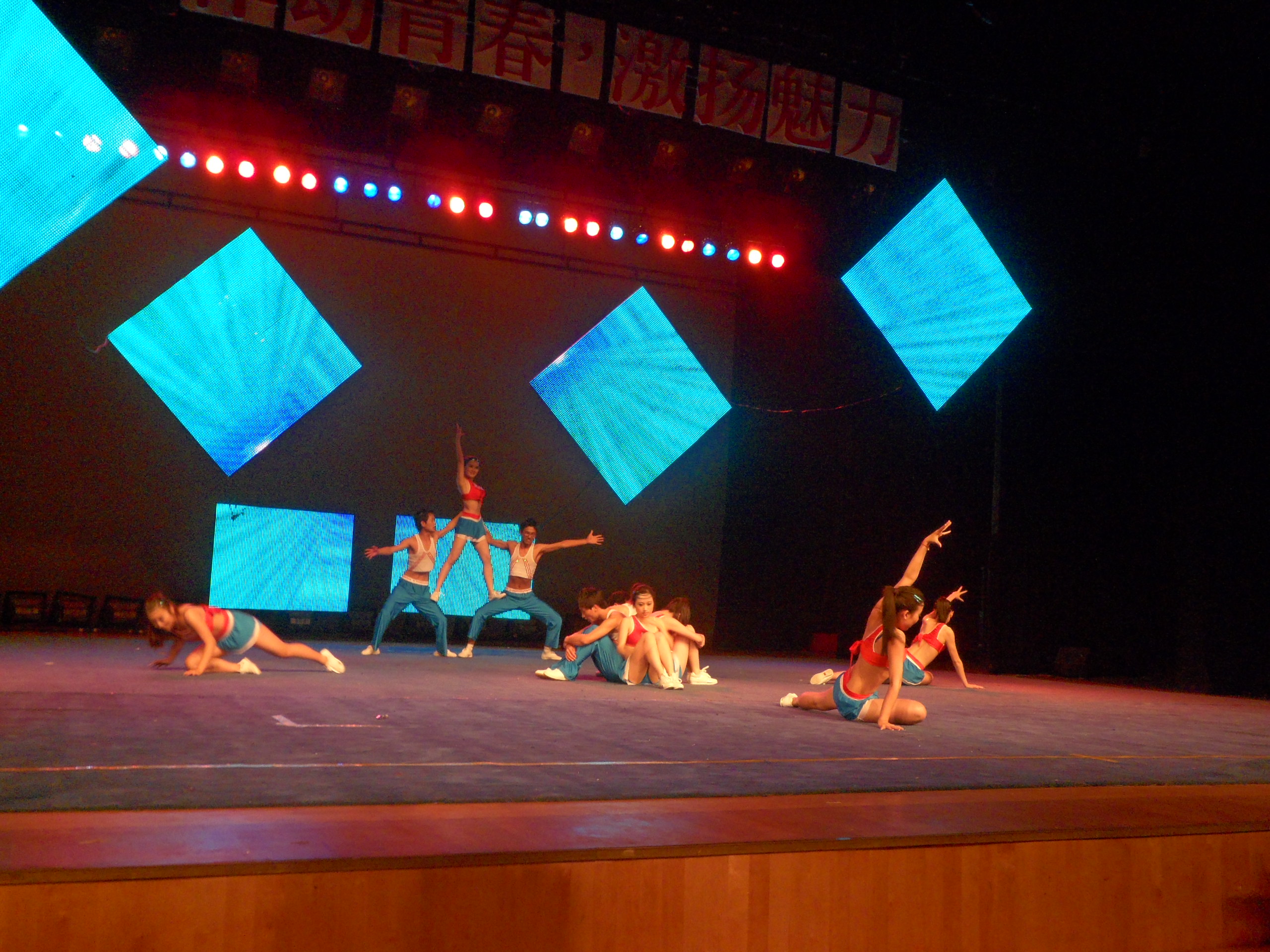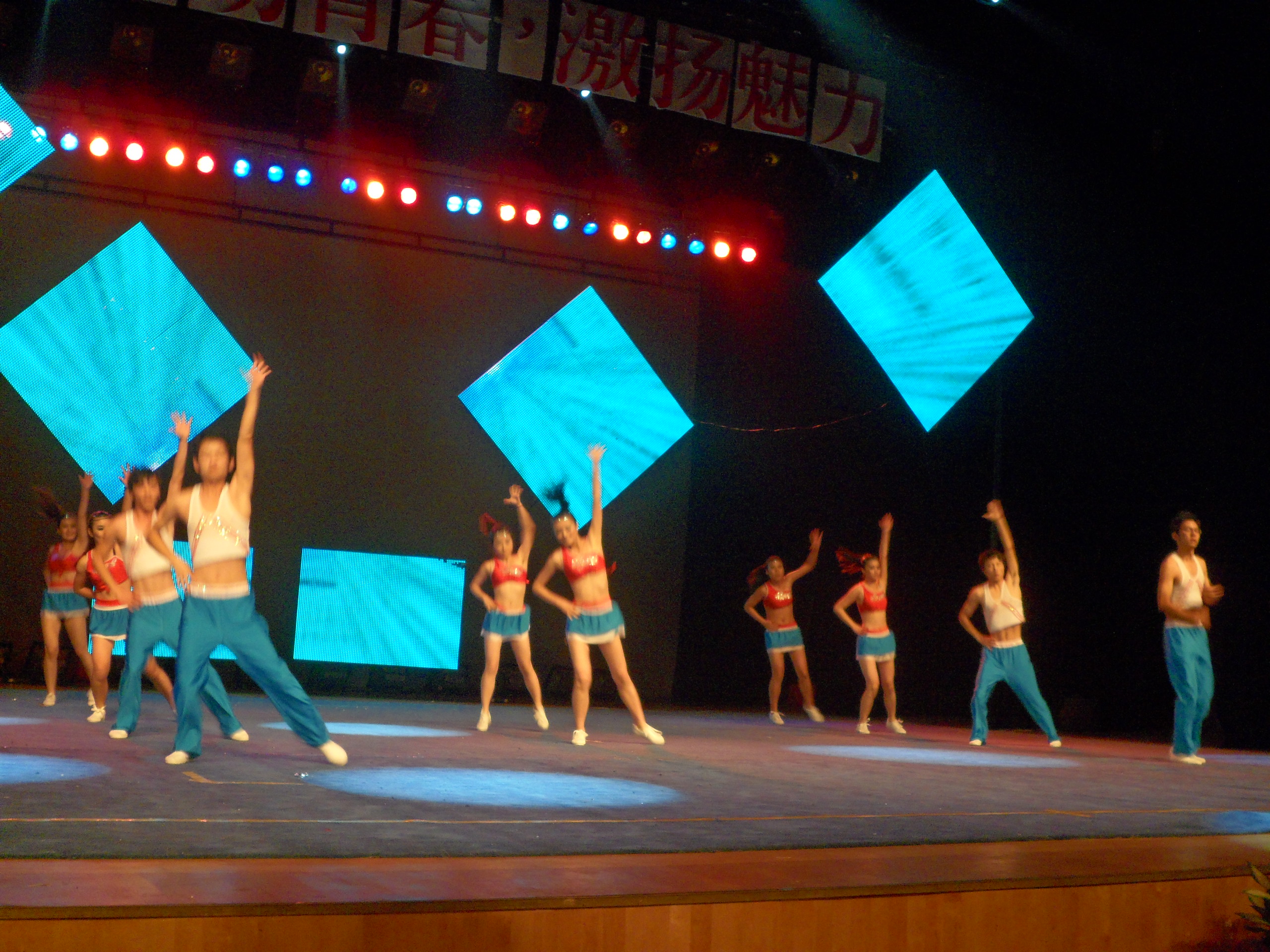 代表队为大家带来的是《健力宝宝》,队员们动作到位、标准,赢得掌声一片,他们平时辛苦的训练没有白费,真是台上一分钟,台下十年功。我们看到每一位运动员都认真投入地在舞台上做着每一个动作,轻盈的跳跃优美的弧线,和最后高难度的亮相,大家都配合的十分默契。