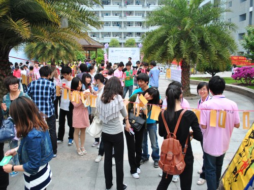 开幕式结束后便开始了文化长廊活动。五颜六色的卡片上有各种各样丰富多彩的题目,如同一叶叶彩色的小帆被悬挂在细细长长的绳子上,温大C区中心花园俨然一片文化知识的海洋。文化长廊由七部分贯穿而成。穿过“字谜宫”,迈入“成语屋”,踱过“诗词斋”,走进“对联馆”,还有 “名人轩”、“繁简堂”、“象形殿”等着我们去探索。