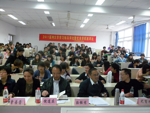 副院长饶道庆对活动致辞。饶老师指出学习研究要耐得住寂寞,基础就是应用,要增强学科信心。紧接着,主持人向大家展示了上学期优良学风班的风采。在一片掌声中,参加本学期优良学风班评比的08广告本、09历本和09中本一班这三个班的班长分别展示了班级取得的奖项、优秀学生、各种活动和其他个性化的成果。同时,评委老师公平公正地为各个班级打分。然后,主持人向大家介绍了上学期的四名优秀的学习标兵。其中,学习标兵姚瑶和大家分享了学习方法和学习心得。接着,活动进入评比学习标兵的环节。16名候选人通过演示文稿和演讲的形式向大家展示自己,他们立足学习成绩、先进事迹、学习方法与心得等方面介绍。与此同时,评委老师和大众评委从学习事迹、参加班级和团日活动情况、现场演讲等情况为候选人打分。最后,活动在党总支副书记骆锤炼老师精辟的总结中圆满结束。