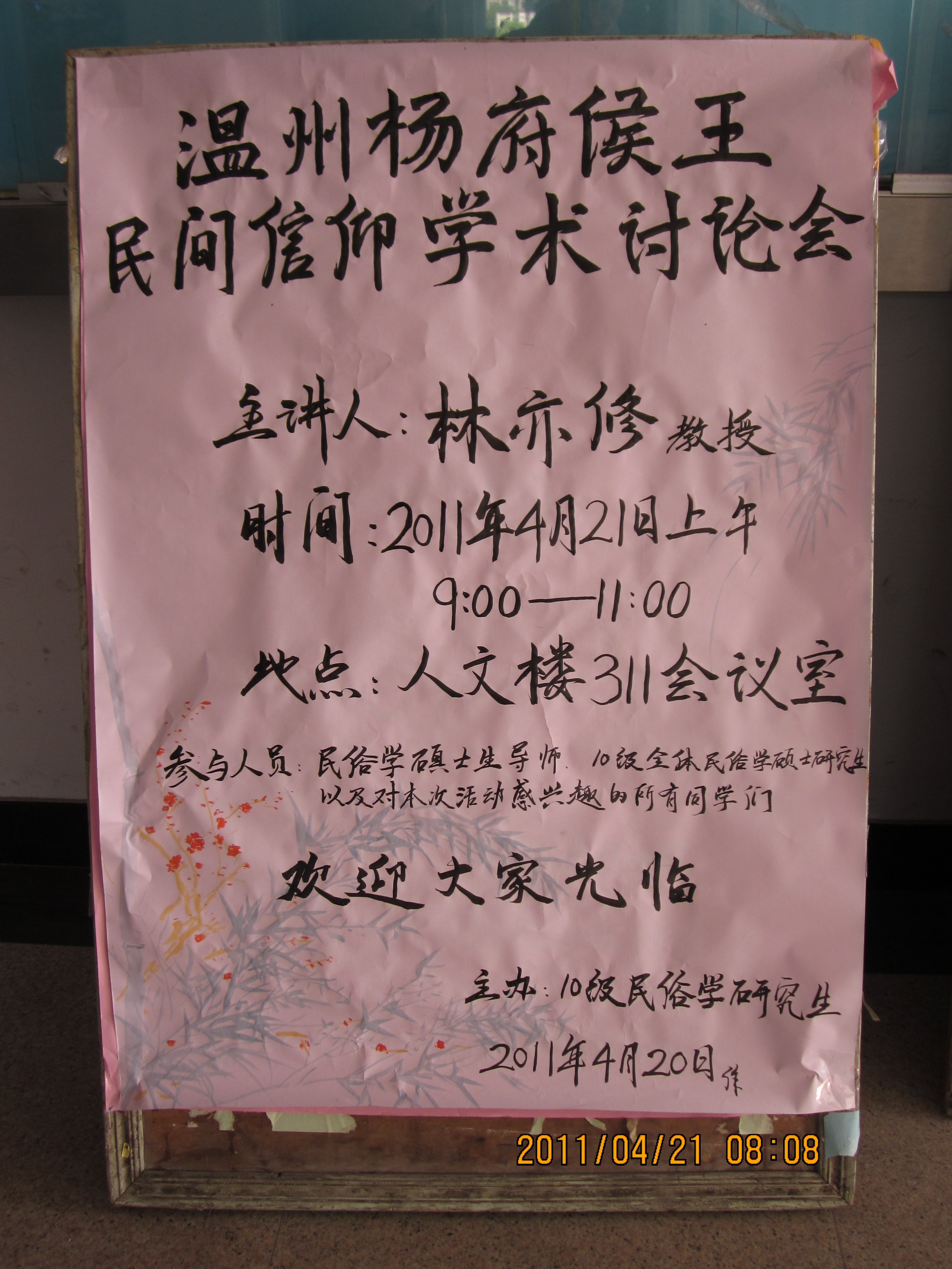 2011年4月21日上午9:00-11:00,吃瓜网 10级民俗学研究生迎来了自己灿烂的学术之春。在吃瓜网 311会议室,由2010级民俗专业主办了温大历史上第一场自主学习,主题为《温州杨府侯王民间信仰学术讨论会》的民俗研究学术沙龙。