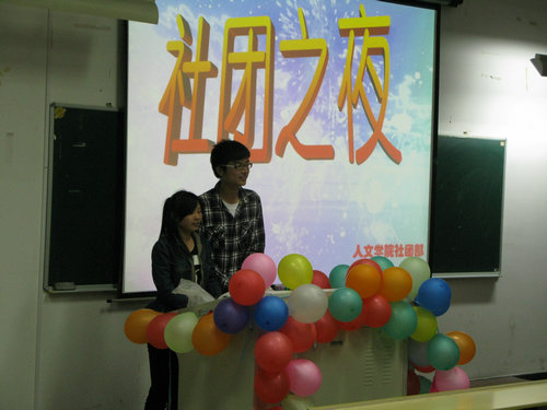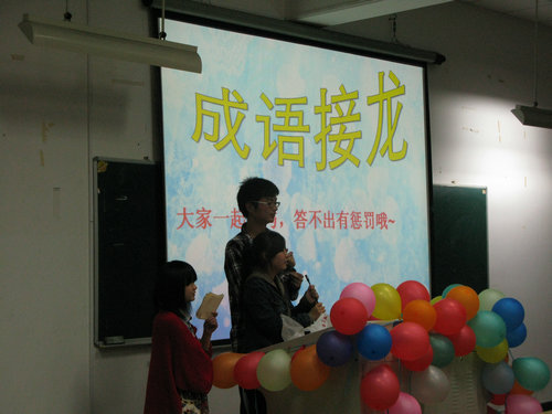 团委学生会社团部负责,社团部石泽天、范韵茹主持。秘书协会、跳蚤协会、红楼协会、院艺术团等四个社团的代表分别向大家介绍了自己的社团以及自己参加社团活动的经历和感受。其间还穿插了“接故事”、“看电影猜问题”、“成语接龙”、“你来演,我来猜成语”等生动有趣的游戏。现场欢声笑语不断。晚上八点,联欢会在一片热烈的气氛中顺利结束。