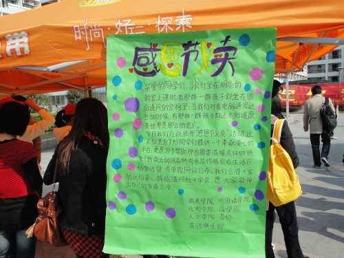 、商学院、机电工程学院、化材学院四个学院的青年志愿者协会以及英语俱乐部在温大C区凉亭共同合作开展“感恩节义卖”活动。