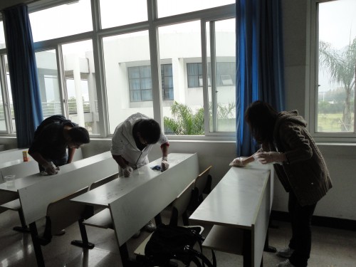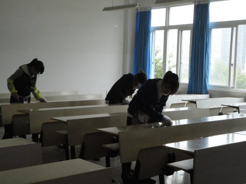 当日上午,青协干事召集了事先招募好的志愿者,为其分发手套,抹布等清洗工具,并对其进行分工。鉴于课桌的干净程度不同,故每个教室分配了两至三个志愿者。志愿者们都很积极。戴上手套,拿上抹布,倒上香蕉水,便开始擦洗桌上的污渍。为使志愿者能顺利进行清洗活动,青协干事时不时穿梭于各个教室并为其倒置香蕉水,更换手套等。经过两个多小时的工作,志愿者们终于结束工作。课桌变得崭新,教室也瞬间通亮起来。