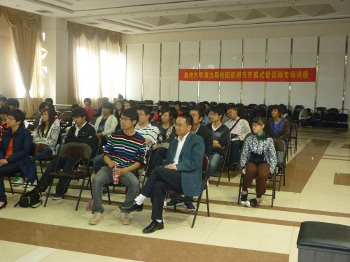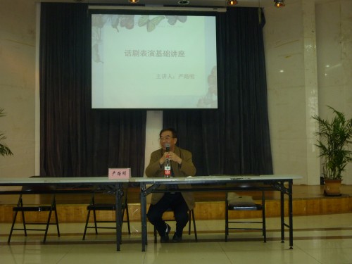 话剧节的相关事宜,包括话剧剧本的要求,LOGO设计大赛,表演大赛和奖项设置。骆老师的细心讲解和要求使同学们进一步明确了参赛的规则和程序。接着严教授进行了话剧表演基础的专题讲座。 第一强调了话剧的特点:内容上反映现实和形式上主要由语言,动作,表情来展现等。第二教大家怎样导演小话剧:其中包括分析剧本,导演构思,导演阐释,排练和修改等几个方面 ,为同学们参赛提供了正确的引导。第三主要讲解了“怎样表演好话剧”。严教授告诉大家演好话剧一定要敢于表现从而挖掘规定情景,并且要以假当真,身临其境,思考剧本的台词挖掘潜台词等。