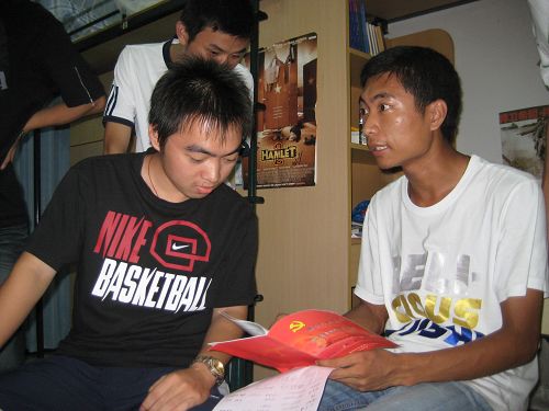 晚上6:30,党员们一起行动,每两个党员为一组与一个新生寝室结对。党员们一进寝室就受到了学弟学妹们的热情欢迎,让大家倍感亲切。党员们和新生们坐在一起侃侃而谈,谈党、谈学习、谈工作以及他们正要面对的大学生活。在谈话中,党员们发现新生中有很多志愿加入中国共产党的同学,然而他们对于一些入党的程序和基本的党务知识却还是不太了解,因而党员们向他们重点介绍了入党的程序和相关党务知识。