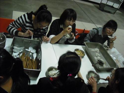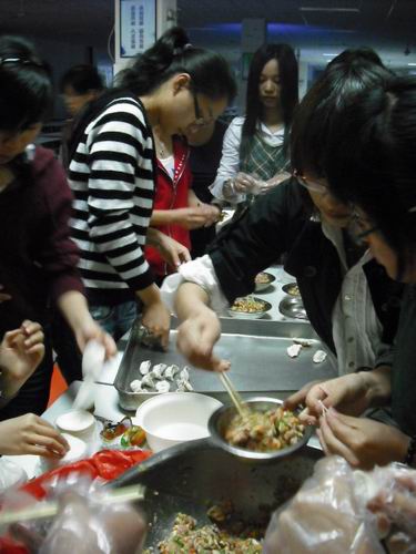 等到肉馅,饺子皮,水,生粉一系列原材料在桌面上排好,同学们一个个迫不及待地开始了“浩大的工程”了。活动以寝室为单位,一开始大家就显示出了高涨的热情。面对这样的细腻活,心灵手巧的女生具有明显的优势,凭借着娴熟的手法,放馅,沾上水,折皮,揉捏,一个个精美的饺子便诞生了。而男生这边,也是不甘示弱,然而由于普遍缺乏包饺子的劳动经验,做出的饺子个性十足,形状别致。大家边包饺子边谈论大学生活和趣事,气氛十分活跃。 最后,大家围坐在一起,享受着自己的劳动果实——热气腾腾的饺子,每一个人脸上都洋溢着快乐的神情。