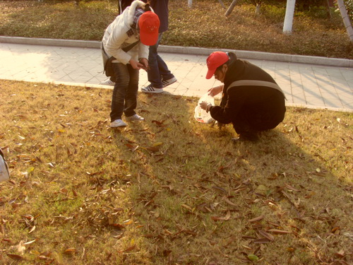 下午3:20,志愿者们从北校出发。首先来到了学子广场。寒风将树叶吹得到处都是。志愿者们便一起将凌乱在道路上的落叶清理到路的两边,围成几堆,还校园一个清洁的面貌。同时将其中各种完整的树叶拾起,为本周三同瓯江学院共同组织的志愿活动准备材料。随后,大家又来到南校图书馆附近。大家卖力地清扫,并细心地从树叶堆中挑选树叶。忙碌了两个小时后,大家拎着收获的叶子,迎着夕阳,结束了本次活动。