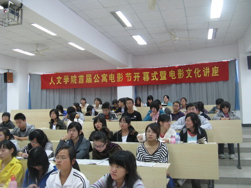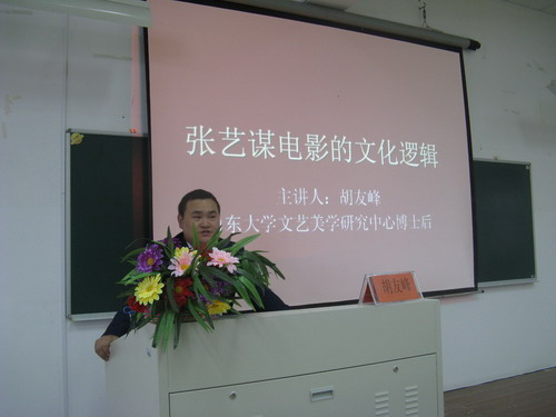 首届"公寓电影节"的开幕式,主讲人是山东大学文艺美学研究所博士后胡友峰老师。首先胡友峰老师介绍了全球电影的多种模式以及张艺谋的简历,通过年谱展示了张艺谋从一个普通人一步步迈向高峰的全过程。其中穿插介绍了张艺谋的多部大作,如《大红灯笼高高挂》、《秋菊打官司》、《活着》等影片,让我们看到了一个勤奋认真、低调平和的大导演,也见证了他的成功之路。之后胡老师又用精炼恰当的语言对张艺谋的电影进行了总体概括,提炼出了"最有生命力的激情"、"最深沉的讲述"、"最诗意的武侠"等精辟的形容词,让我们对张艺谋的电影有了一个整体性的印象。