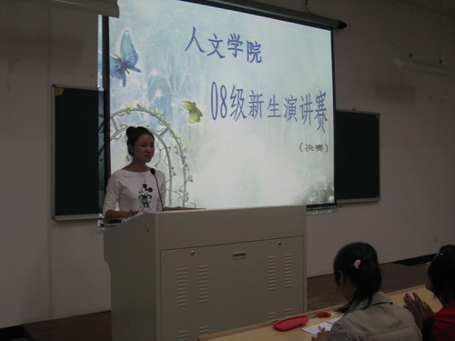 203正式开始。诗人熊国太老师、辅导员曾蓓蕾老师、麻法全老师以及07级新生演讲赛一等奖获得者黄剀元同学担任了本次比赛的评委。