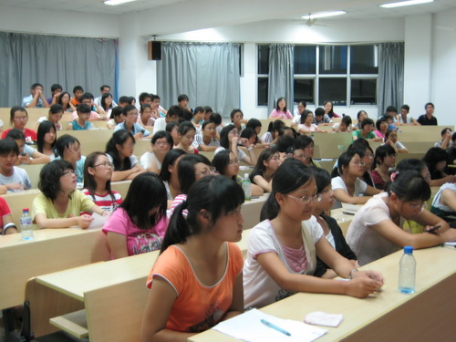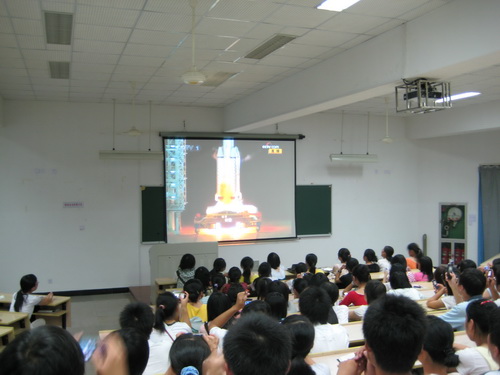 08级新生汇聚人文楼203教室观看“神舟七号”发射现场直播。中共中央总书记、国家主席胡锦涛亲临发射现场,同时吴邦国、贾庆林、李长春、习近平等中央领导人也来到北京航天飞控中心观看“神七”发射。