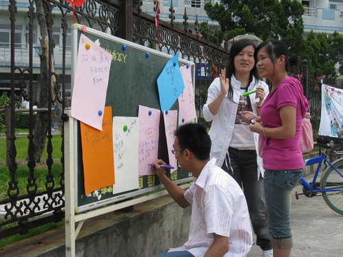 活动虽然结束了,但活动的精神依旧在你我心中。一面面小国旗,是我们同学对祖国最真挚的感情,一个个奥运徽章是他们对北京奥运最绝对的支持,一幅幅看似漫不经心的涂鸦画却是温大人在迎评期间的美好祝愿。蓝天下,我们一起展望温大的未来;清风里,我们一起为学校祝福祈祷。