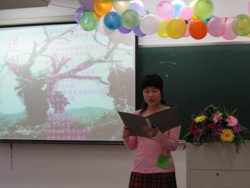 07历本黄凯元的《将进酒》气势磅礴;瓯江学院胡鹏城则让我们一览才子的风采,博得在场观众的啧啧称赞;教育学院05小教本一的孟晓宁更是出色演绎了一首《饮九月初九的酒》,受到评委们一致青睐。值得一提的是,在诗歌的选材上,部分同学较为注重时政性,如"北京奥运年"和近来颇受关注的"藏独"事件,足见同学对取材的独到与对祖国的热爱。