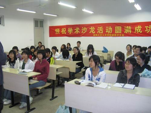 这次活动一直持续了近3个小时,掌声,笑声,喝彩声不时回荡在整个教室。曹珉等6位同学获观点新颖奖,陈娇娇等4位同学获积极参与奖。活动的最后,苏教授对这次活动表示了极大的肯定,他认为沙龙的形式比课堂更加轻松化,这有利于理论的研究更加通俗化,生活化。他殷切的期望下次活动中07的同学能表现的更加积极踊跃