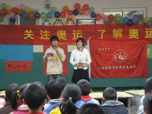 益民学校是一所民工子弟学校,此次活动是在上周“奥运讲堂”和“奥运知识图片展”等活动的基础上继续展开,进行的是最后一个环节:奥运知识大挑战。比赛包括必答题、抢答题、小游戏“猜奥运”、描述题、风险题和观众互动问答等六个部分。在比赛中,小选手们各个争先恐后,积极抢答,可以看出赛前他们都做了充足的准备,有信心、有能力应对各种挑战;而身后支持他们的小伙伴,也时不时的出谋划策,为各自的选手加油呐喊;同时作为智囊团加入到选手中间的志愿者,也发挥着积极的作用。最后,经过激烈比拼,前三名获得了精美的礼物,而未获名次的选手也得到了一份纪念品,可谓皆大欢喜。通过此次活动,不仅丰富了益民学校孩子们的课外文化生活,更加深了他们对奥运知识的了解,进一步提升他们关注奥运的热情。