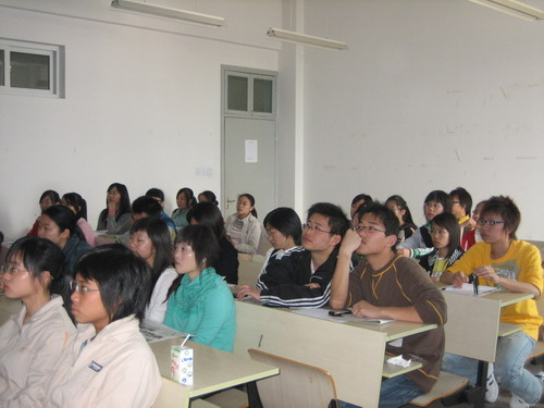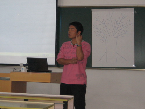 课程一开始,大家的注意力就被岳建同学朴实自然而极富亲和力的讲课方式深深吸引了,在利用电子杂志等资料简单介绍了大学生绿色论坛的相关情况后,岳同学在同学们中间开展了一系列新颖有趣并且富有参与性和启迪意义的小游戏。在这个过程中,他一直在努力地营造和保持一种轻松自然,真诚坦率的良好氛围。在他的引导下,大家闭上眼睛接受舒缓情绪的催眠,接着在一张画在白纸上的树上贴上自己对于加入这个团队的愿望,,然后起来和其他人一起分享想法。此外是分组以自我介绍和反复介绍队友姓名班级及习惯动作为主的交流活动。岳建同学还不时在旁指正或开开玩笑。整个流程在坦诚融洽和欢声笑语中进行着,大家的脸上洋溢着由衷的愉悦。