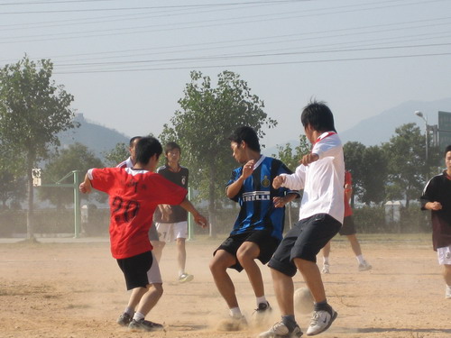 绿茵场上尘土飞扬,足球旁脚乱如麻。在持续90分钟的比赛中,双方队员都全力拼搏,谁也不甘落后。曾一度领先的大一队最后被追平比分。结果4:5,大四队以1分险胜大一队结束了本场比赛。