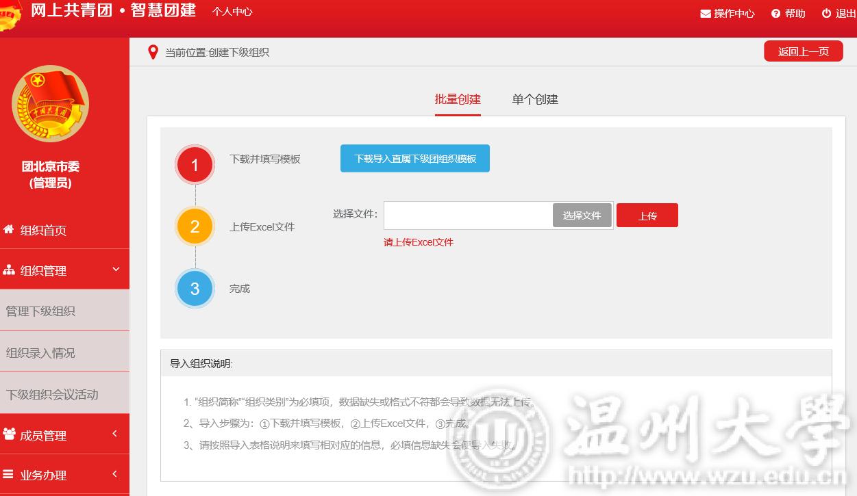 创建直属下级团组织有2种方式:一是批量创建下级组织,通过Excel表格导入的方式,一次创建多个下级组织;二是单个创建下级组织,每次创建一个下级组织。